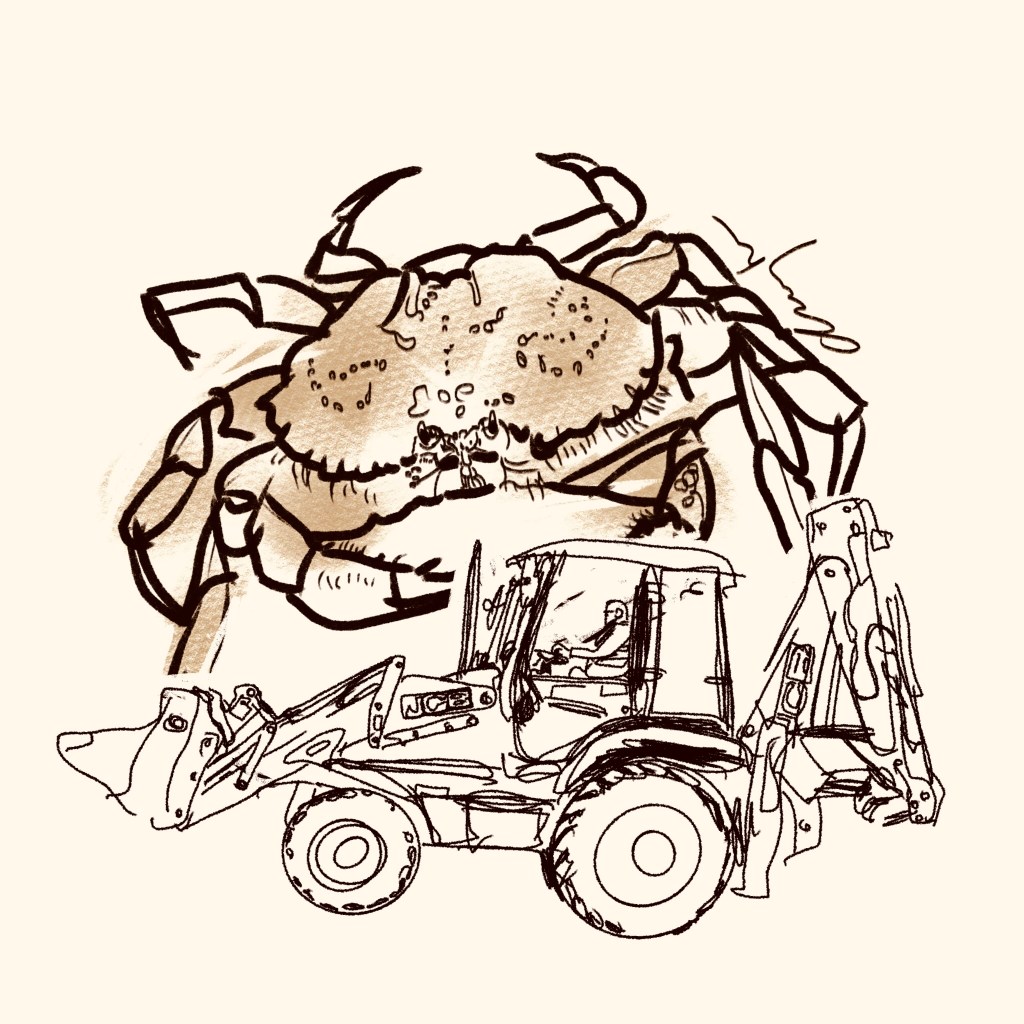 I’m a titanic ten tonne crab / tin can opening a JCB cab / with one fine and furious dab / of its bastard, barnacled claws / whilst the driver dives headfirst through the buckled digger doors / and sprawls / calling and bawling on the pebbly shore / desperately imploring / the abominable crustacean to ignore him / it wasn’t his idea / to start excavations for a new pier / but the crab doesn’t appear / to hear / tosses him down with a monstrous sneer