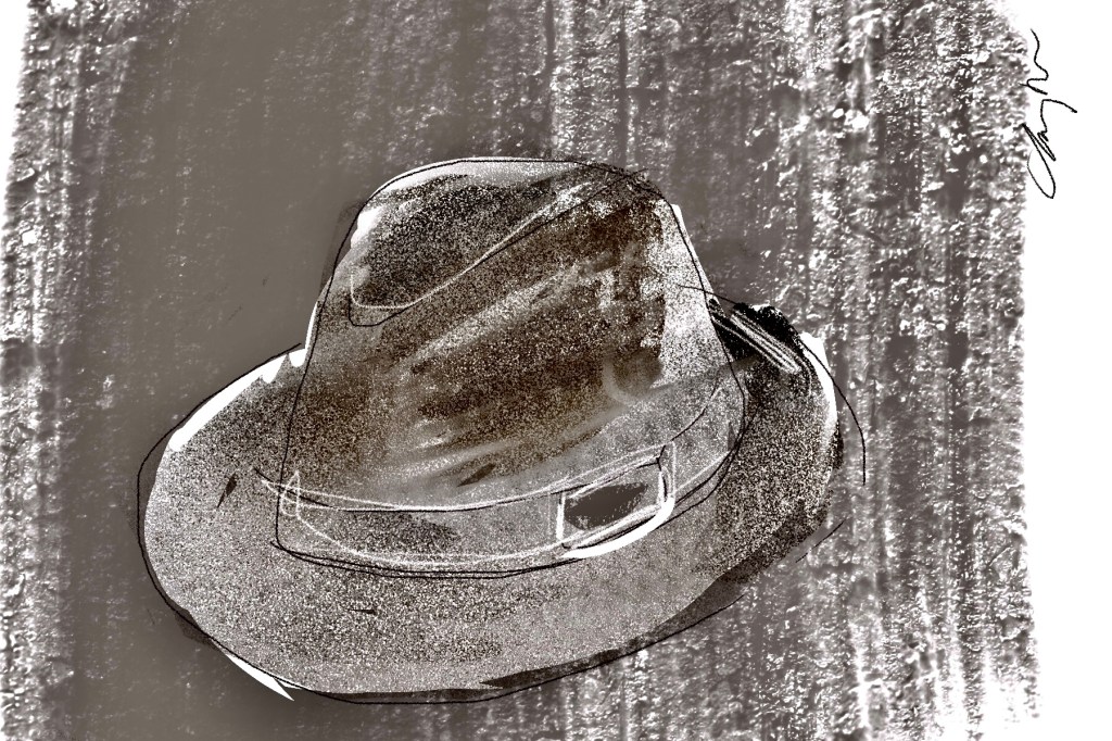 There’s a dark fedora on a pile of old newspapers over by the window. I hand it to him.
