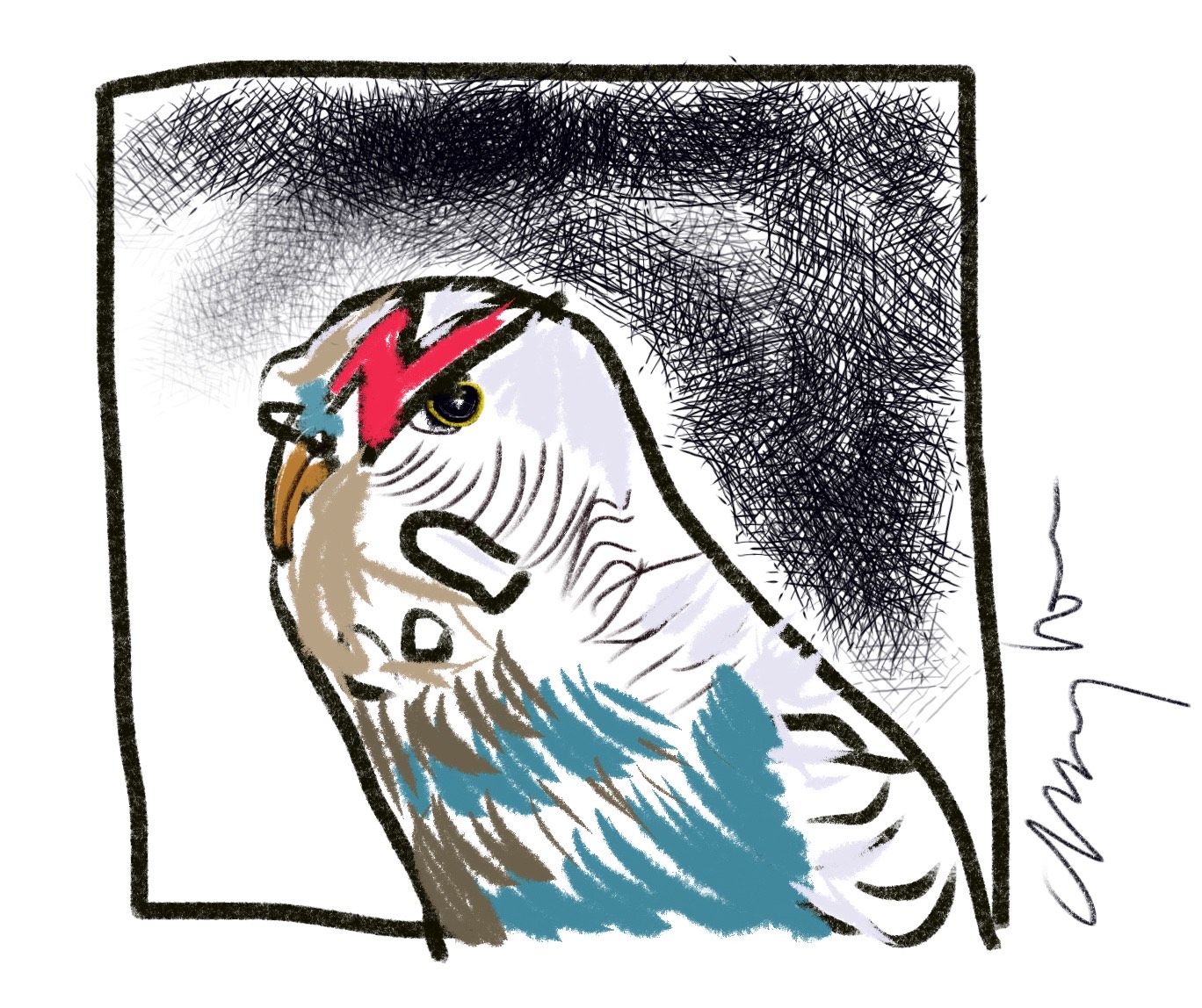 I want to say ‘same’ but don’t. Instead I wade a bit closer, and there she is – a forlorn little thing, like someone covered their thumb in glue and stuck it in a tub of feathers. She’s cowering among the seeds and shit at the bottom of the cage.