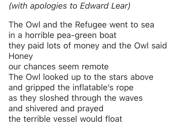 The Owl and the Refugee September 24, 2023 ~ jim clayton Share this: Click to share on Bluesky (Opens in new window) Bluesky Like Loading...
