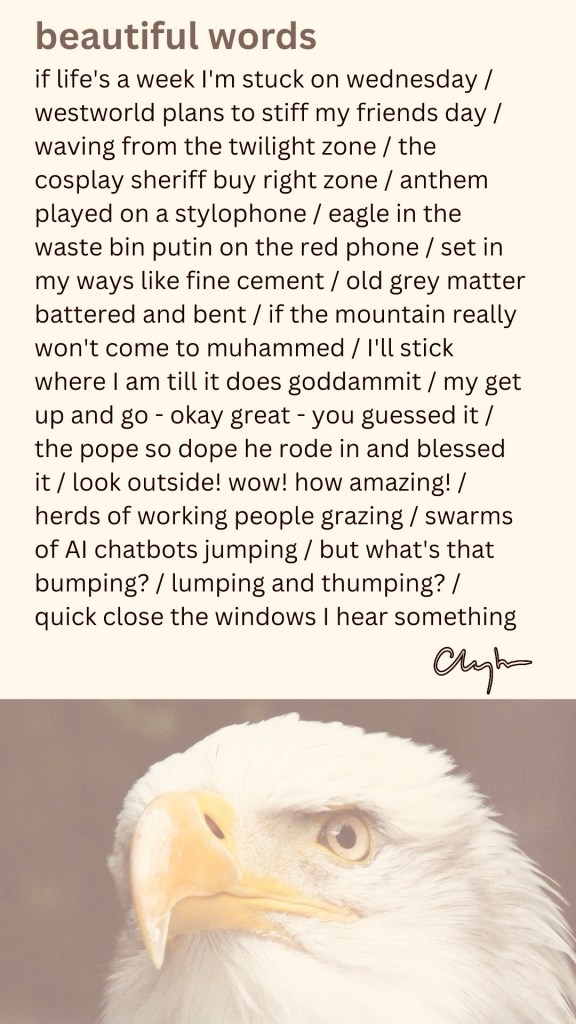 beautiful words April 10, 2025 ~ jim clayton Share this: Click to share on Bluesky (Opens in new window) Bluesky Like Loading...