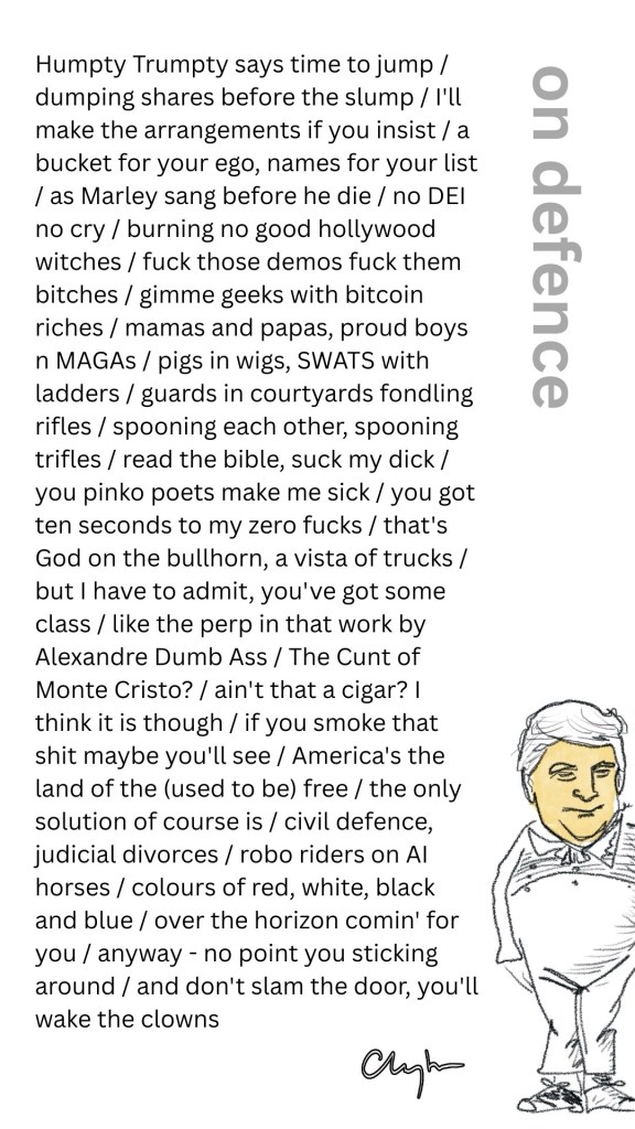 on defence May 22, 2025 ~ jim clayton Share this: Click to share on Bluesky (Opens in new window) Bluesky Like Loading...