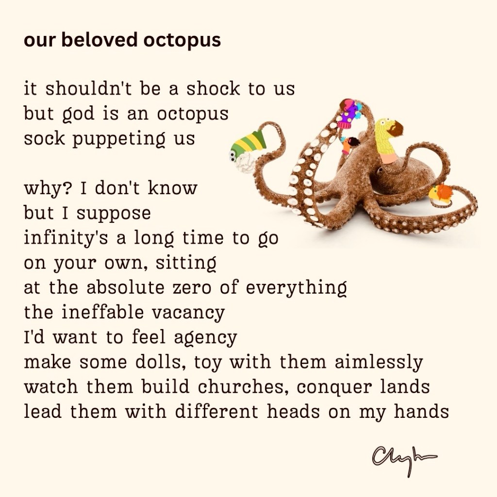 our beloved octopus June 12, 2025 ~ jim clayton Share this: Click to share on Bluesky (Opens in new window) Bluesky Like Loading...