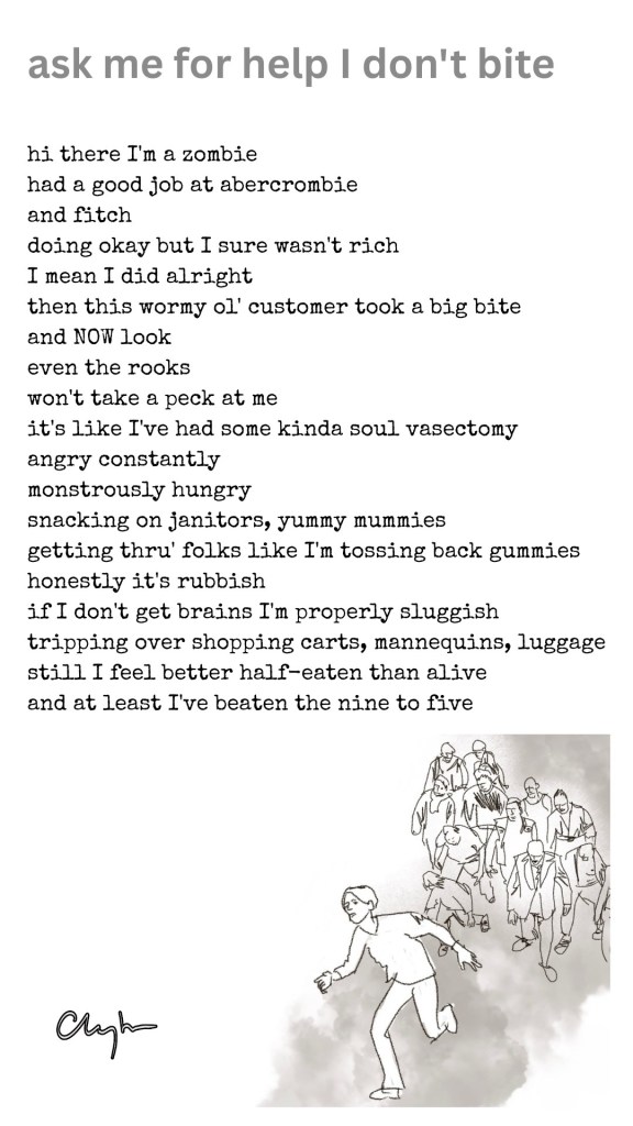 ask me for help I don’t bite June 26, 2025 ~ jim clayton Share this: Click to share on Bluesky (Opens in new window) Bluesky Like Loading...
