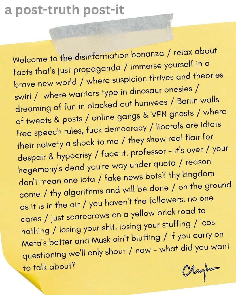 a post-truth post-it December 30, 2025 ~ jim clayton Share this: Click to share on Bluesky (Opens in new window) Bluesky Like Loading...