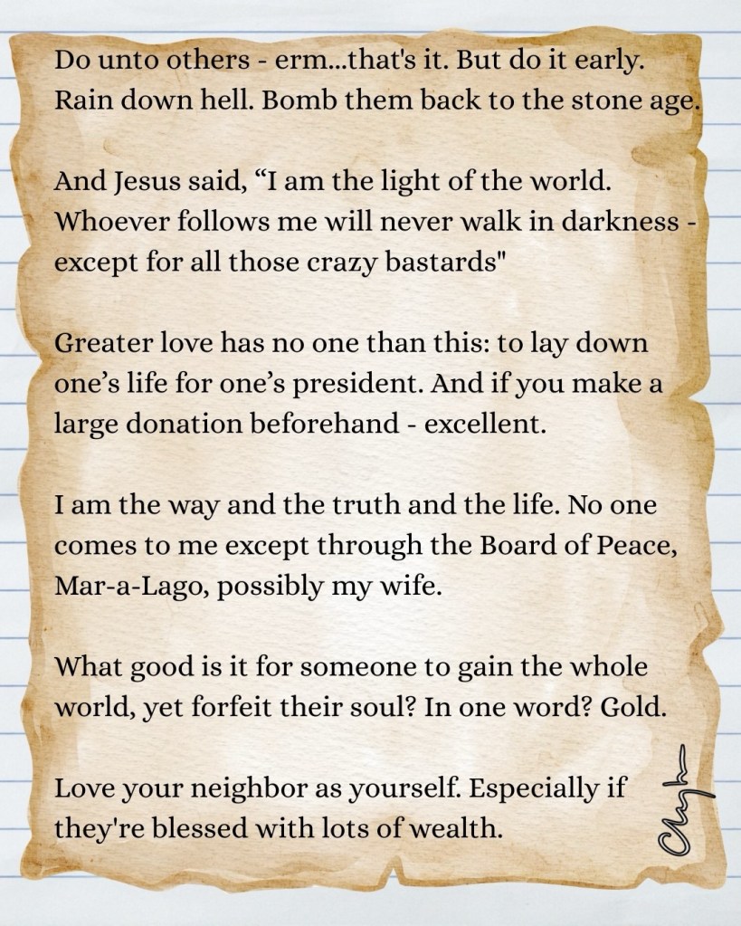 from The All New Christian Book of Trump April 6, 2026 ~ jim clayton Share this: Share on Bluesky (Opens in new window) Bluesky Like Loading...