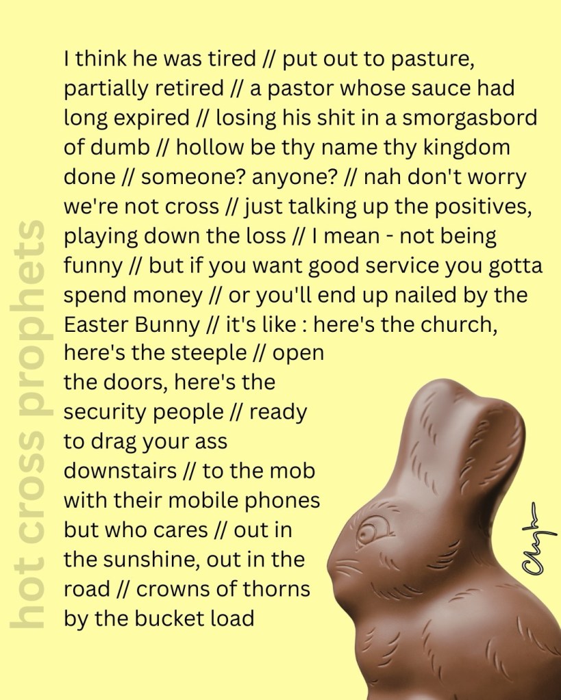 hot cross prophets April 4, 2026 ~ jim clayton ~ Leave a comment Share this: Share on Bluesky (Opens in new window) Bluesky Like Loading...