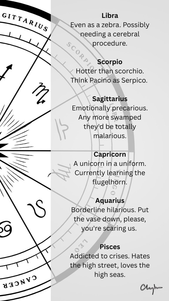 Enthusiastic, emphatic / a flair for the dramatic / you live life to the marvellous max / oriented to the bad boy side of the tracks / in Burberry glasses & Gucci slacks