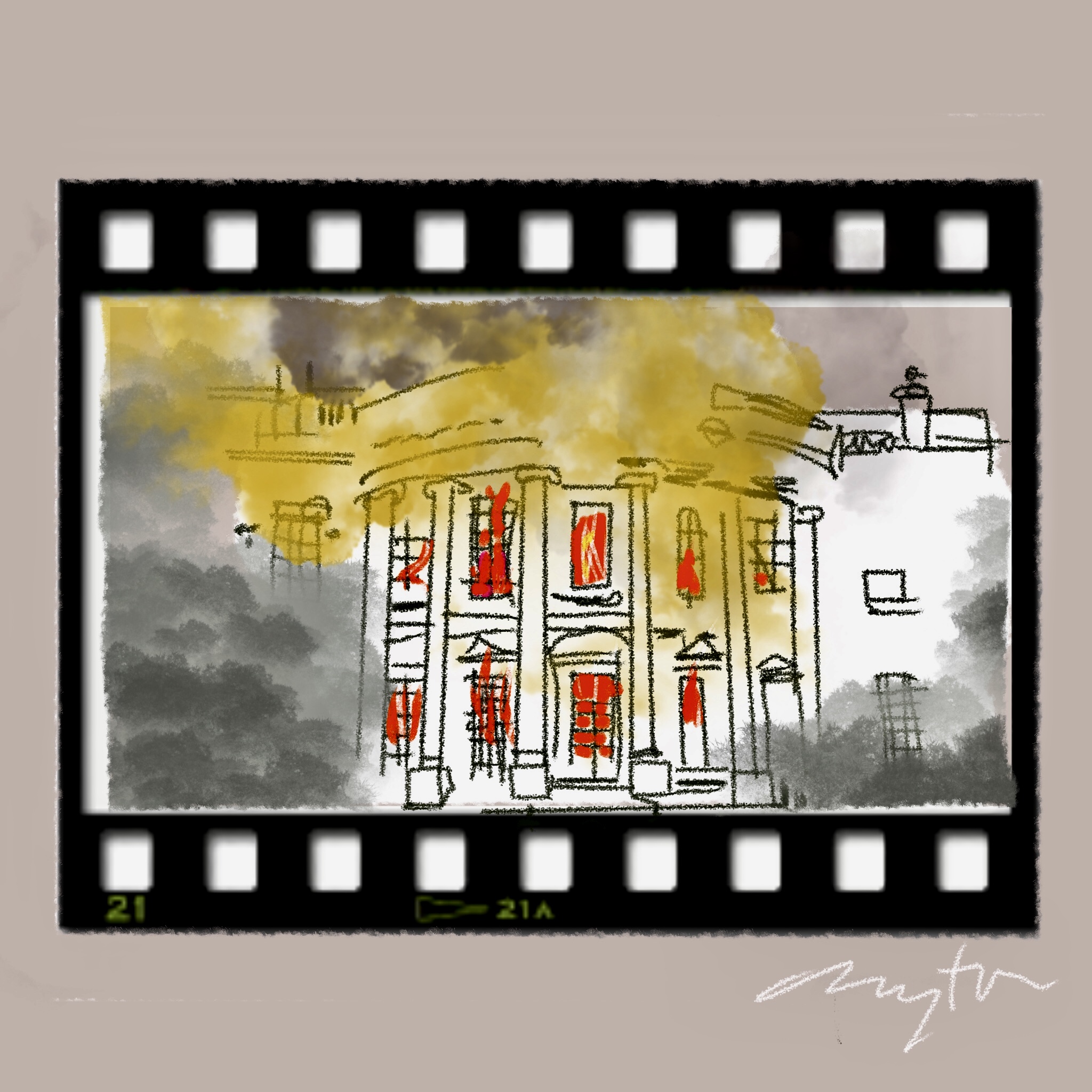by falling office blocks east and west