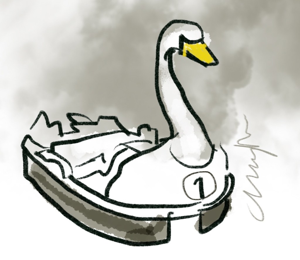 ‘Hang on…’ says Karen, leaning into the door. We all listen.