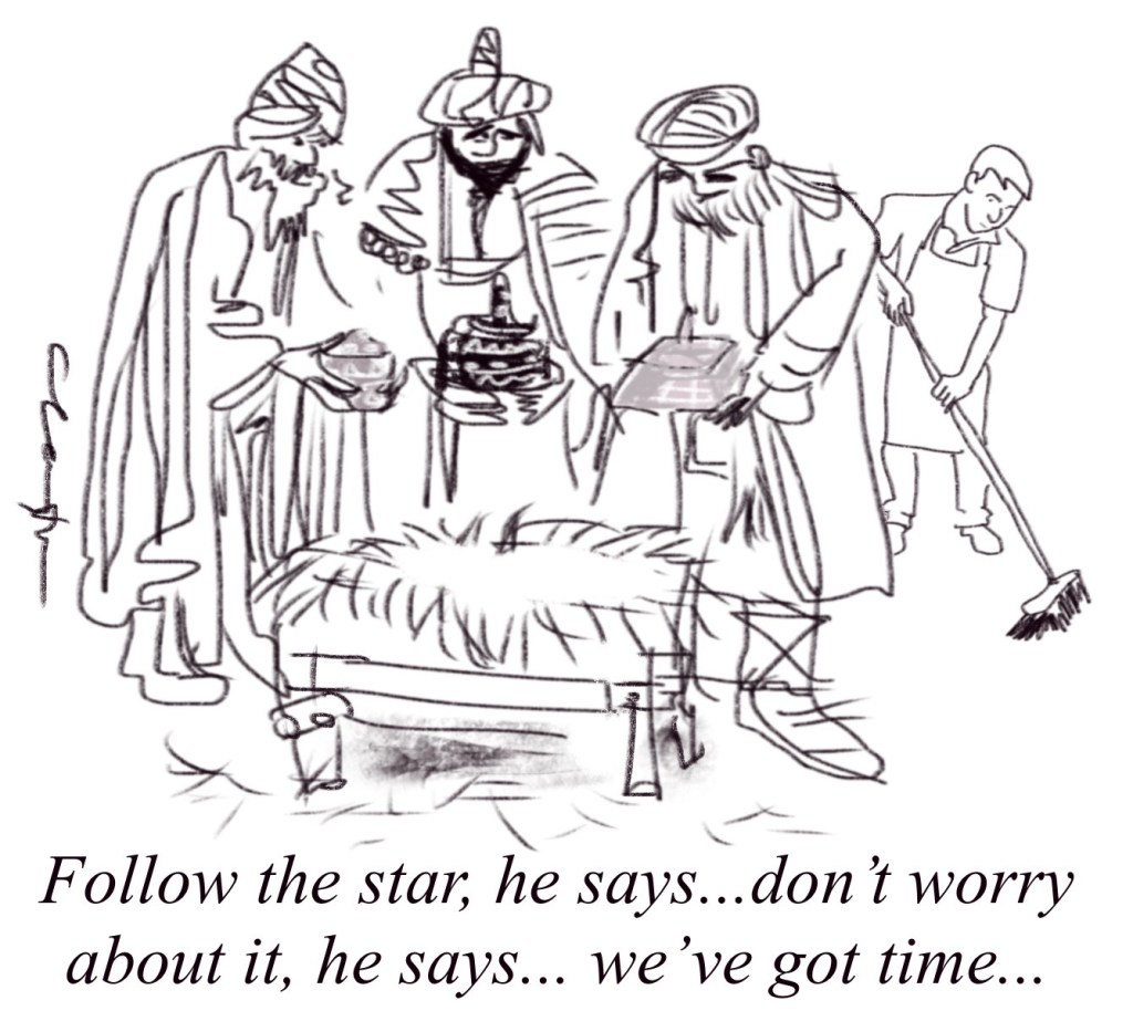 Today we’ve had nothing but thick fog and a cruel variety of fine, saturating rain that makes walking forwards feel like swimming up. It was just as well the weather was kinder all those years ago in Bethlehem, otherwise the Birth of Christ would have featured a comedy moment where three bedraggled kings holding fancy boxes over their heads high-step three hours late into an empty stable where an innkeeper is sweeping up.