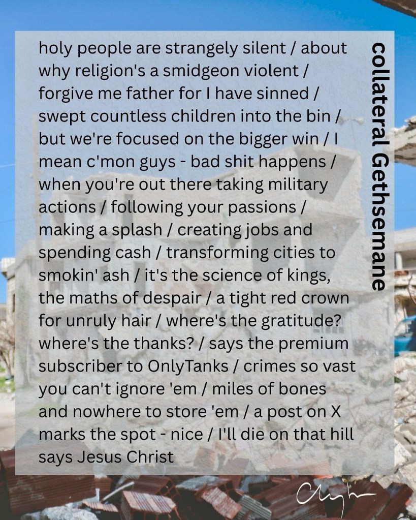 collateral Gethsemane March 3, 2026 ~ jim clayton ~ Leave a comment Share this: Share on Bluesky (Opens in new window) Bluesky Like Loading...