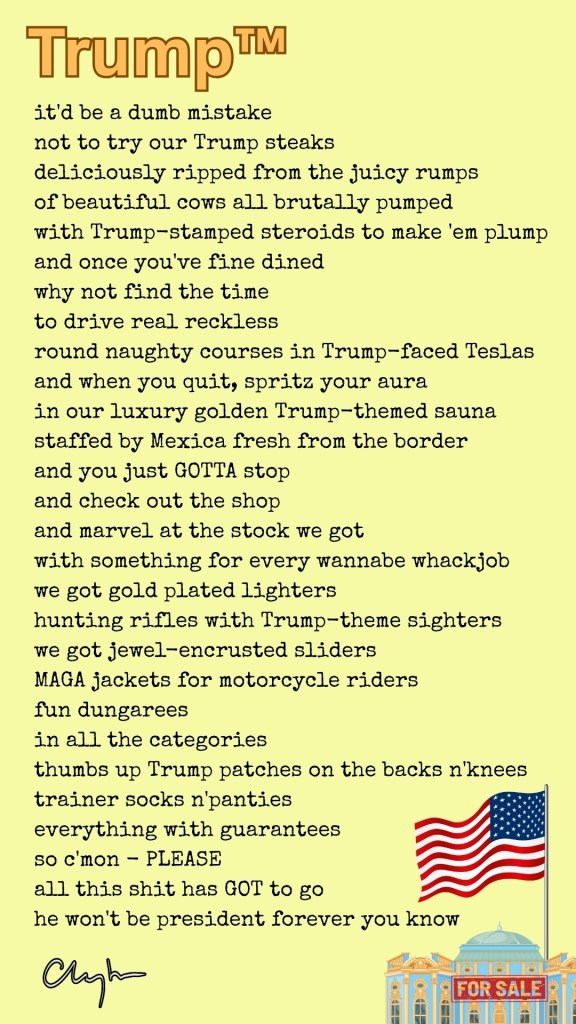 Trumpâ„¢ July 1, 2025 ~ jim clayton ~ Leave a comment Share this: Click to share on Bluesky (Opens in new window) Bluesky Like Loading...
