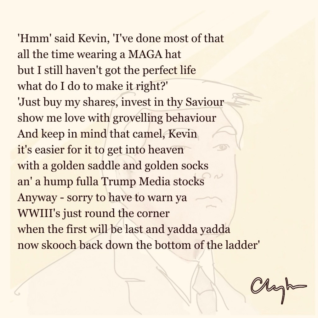 Trump’s prayer July 17, 2025 ~ jim clayton ~ Leave a comment Share this: Click to share on Bluesky (Opens in new window) Bluesky Like Loading...