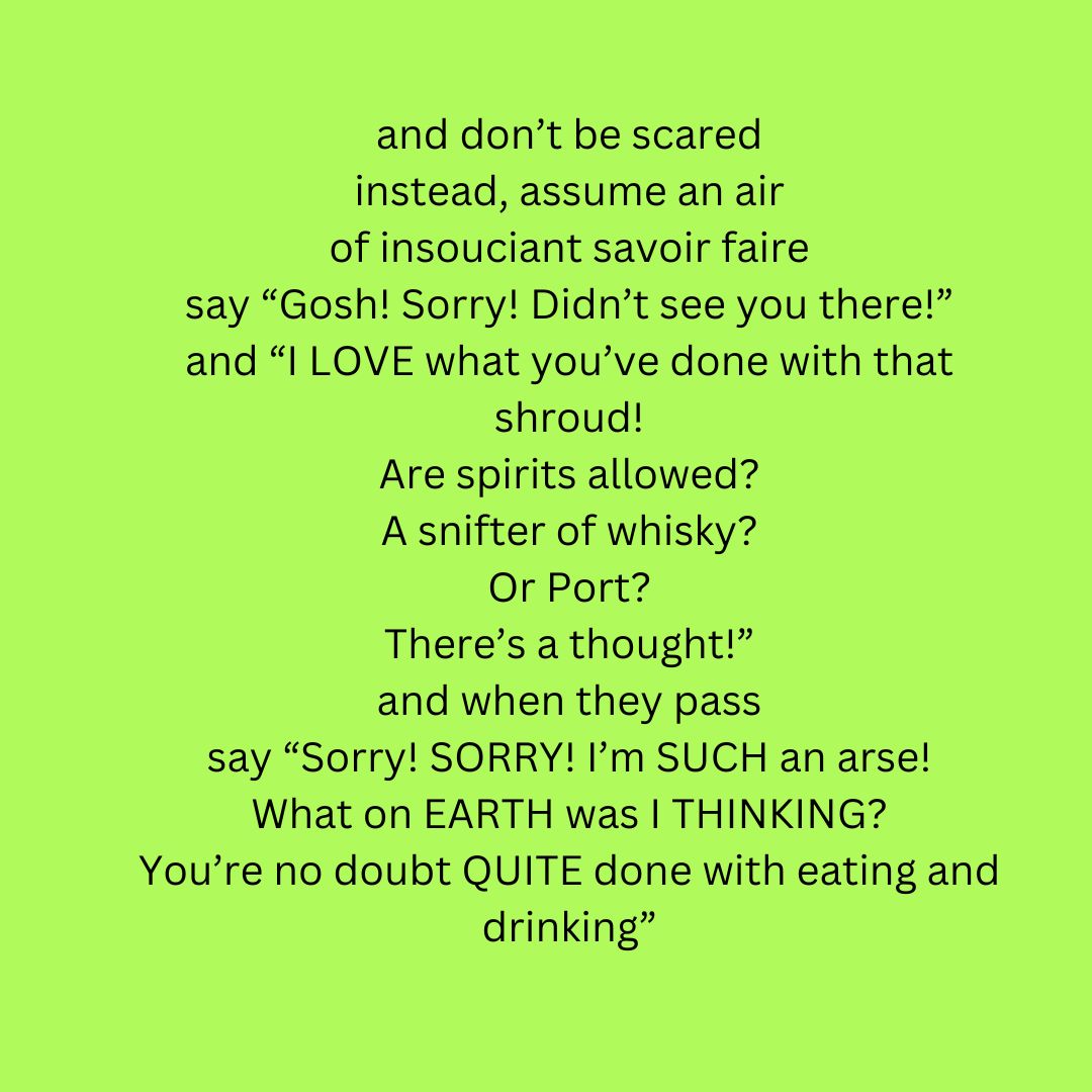 And finally – in rolls the Pumpkin King! / Shocking! / Watch him laughing and waving! / That’s amazing! / Now I’ve seen everything! / Those spiky teeth sawing! / All that public school squawking & guffawing! / And I suppose – who knows? – it might be entertaining / if ‘tragically horrifying’ / was your thing / So there he goes, u-turning / backsliding & backbiting / hackwriting / gaslighting & guessing / a model of fun if it wasn’t so depressing