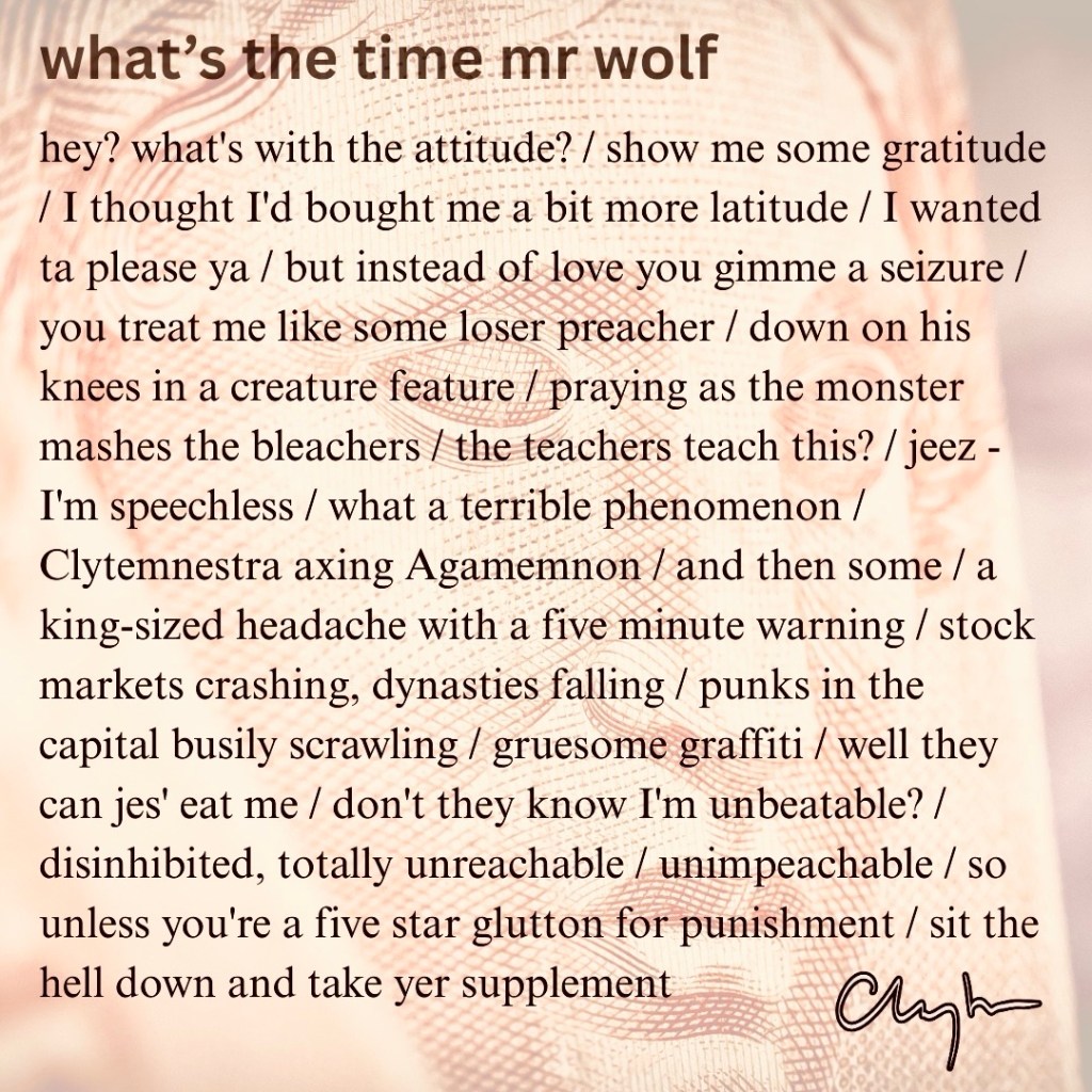 what’s the time mr wolf April 4, 2025 ~ jim clayton ~ Leave a comment Share this: Click to share on Bluesky (Opens in new window) Bluesky Like Loading...