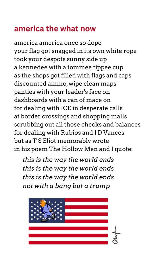 america the what now April 28, 2025 ~ jim clayton ~ Leave a comment Share this: Click to share on Bluesky (Opens in new window) Bluesky Like Loading...