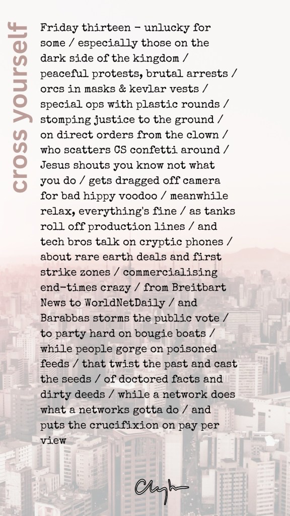 cross yourself June 13, 2025 ~ jim clayton ~ Leave a comment Share this: Click to share on Bluesky (Opens in new window) Bluesky Like Loading...