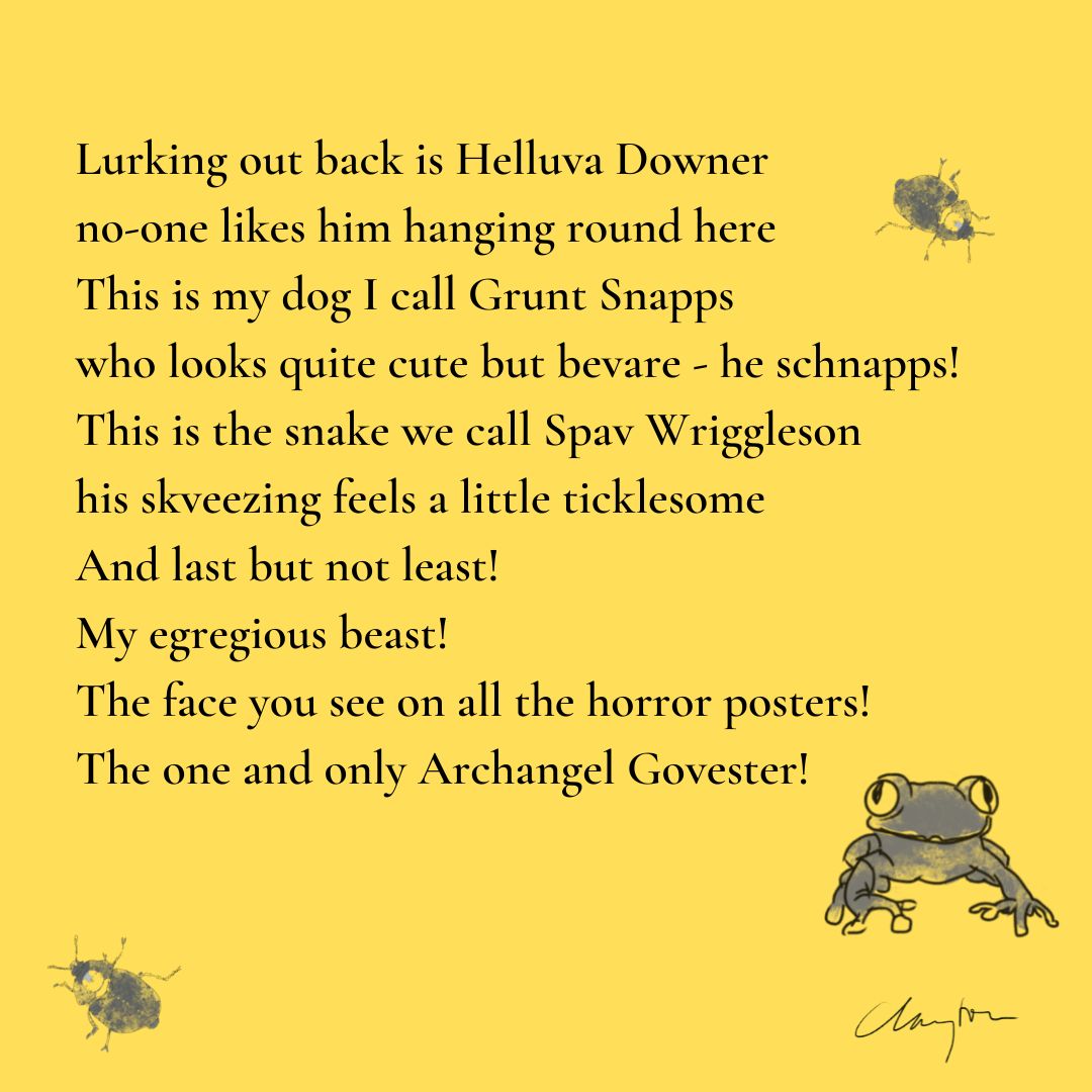 I’m Dishy Rishy in fiscal drag / dipping for lippy in a Gucci bag / leaning back, lighting a fag / saying l’m shagged / I’m like – totally done with your poverty / your endless talk of economic robbery / inequality / but you see? / what really bothers me? / your hair’s a mess and your shoes a monstrosity / now get the hell off my adorable property