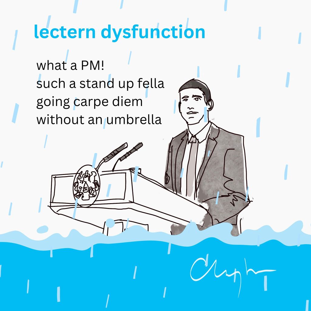I’m the snores not applause / at the end of the Blackpool Tory chorus / shaken awake and stampeding for the doors / too little Capricorn, too much Taurus / the clean up bill enormous / corporate fraud & tax avoidance / cockiness next to godliness / now – it’s all been rather nice / but I see you’re missing the old school tie / so here’s some advice / run for the gates and don’t think twice / I’ll count to five…