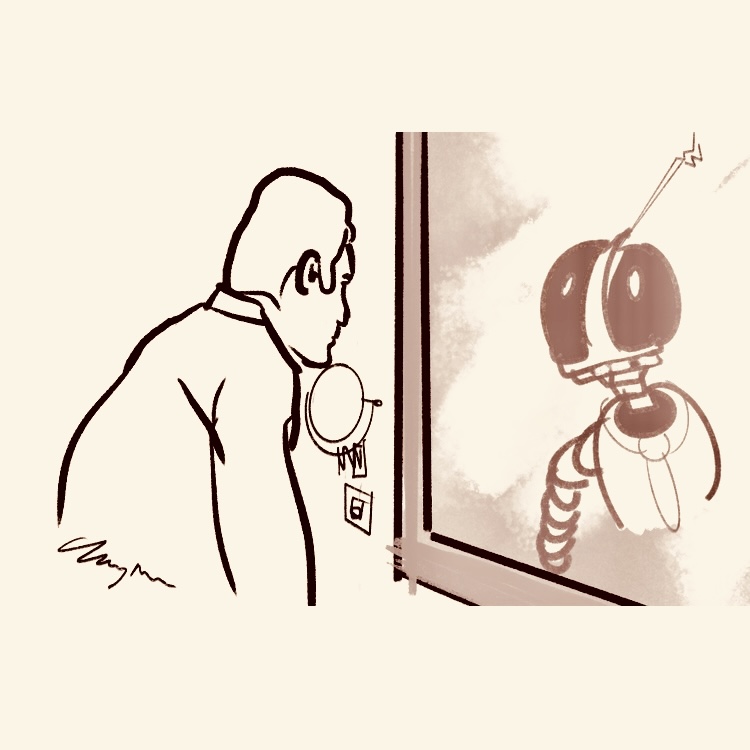 1:06:00 Omega goes crazy and runs over one of the profs. (I told you not to trust that machine – and that’s why I will NEVER have an Alexa)