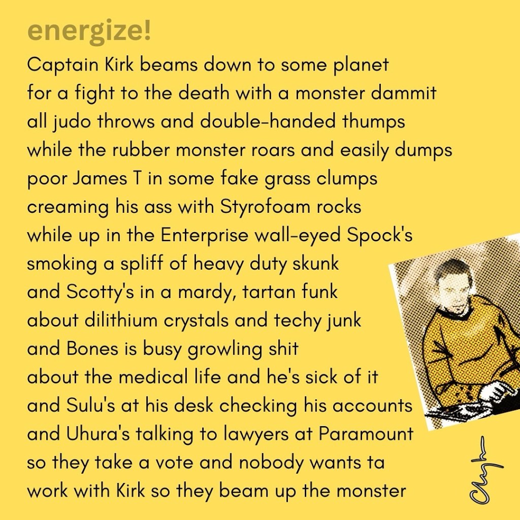 set phasers to defrost, says Kirk / with a smirk / just before a Drakoulia sets to work / with something like a giant spork / so totally brutally / that when Scottie / foul-mouthed and stroppily / checking his readings microscopically / chucks a handful of raw Trilithium / to jazz up his skanky tanks of Dilithium / and the transporter beams wail & warble / and the tractor beams treble & wobble / and the sliders redouble without any repetition of the earlier trouble / suddenly the transporter floor / is spattered with matter and assorted gore
