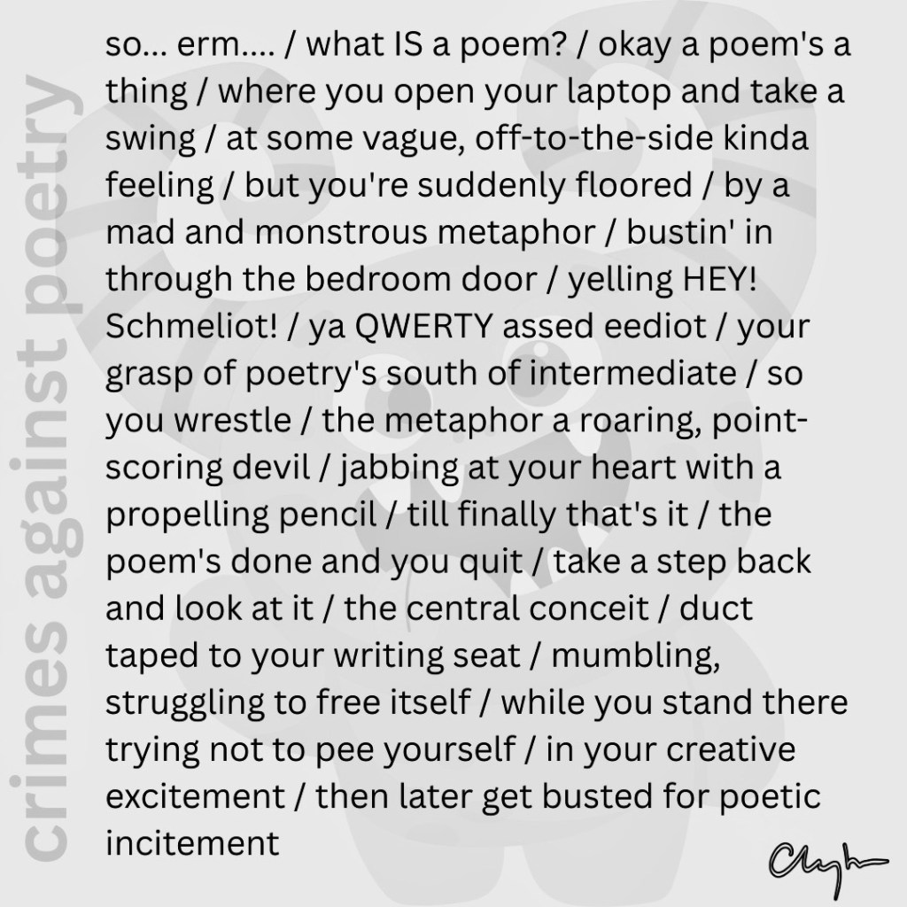 crimes against poetry August 29, 2025 ~ jim clayton ~ Leave a comment Share this: Click to share on Bluesky (Opens in new window) Bluesky Like Loading...